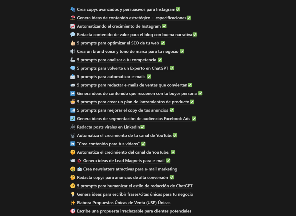 ✅ Prompts ultra específicos: Plantillas estructuradas para que las adaptes a tu marca, asegurando que ChatGPT te genere las respuestas precisas que necesitas. Nada de resultados genéricos.